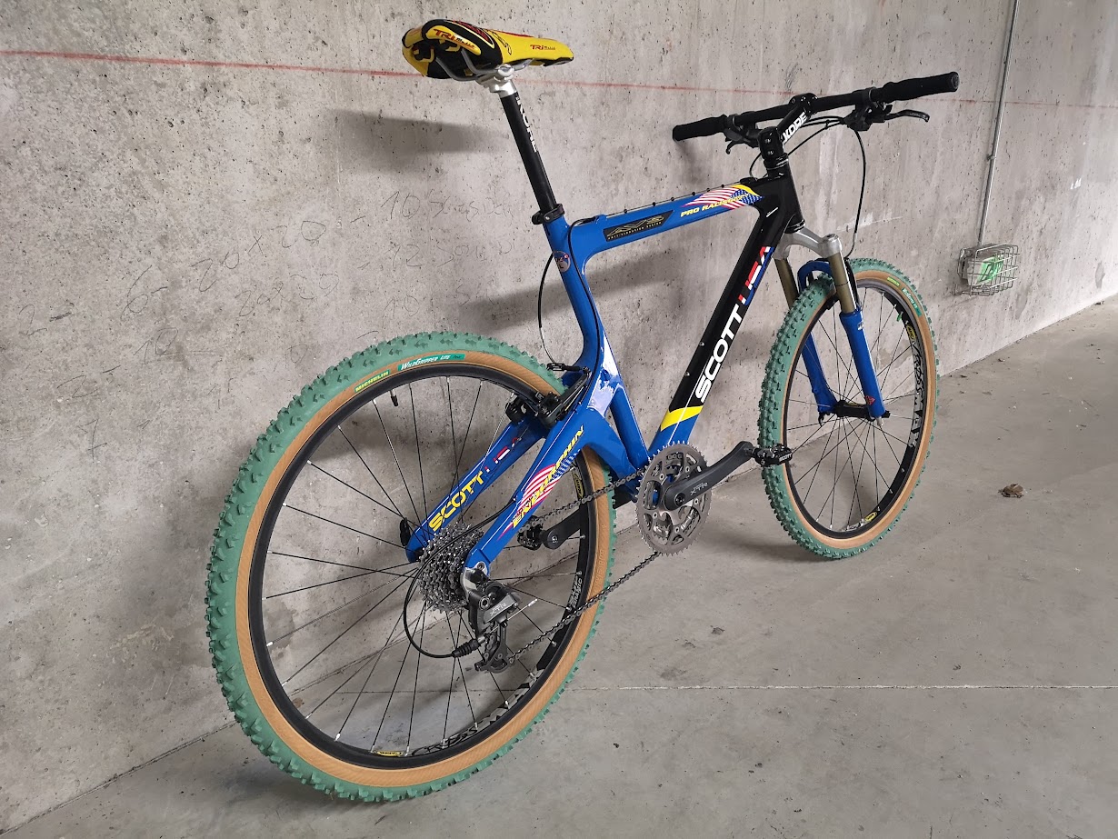 Pour compléter l’ensemble, j’ai monté les pneus Michelin WildGripper Lite verts, devenus légendaires pour leur adhérence exceptionnelle et leur look distinctif. Ces pneus étaient non seulement performants, mais sont aussi devenus un véritable symbole de l’esthétique des VTT des années 90.